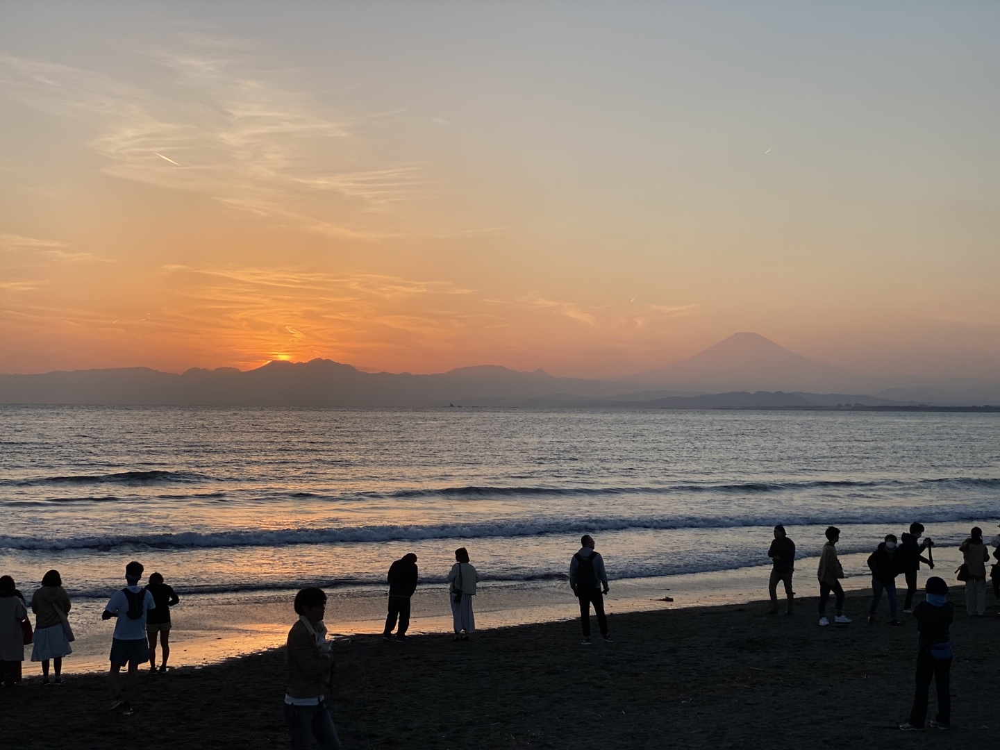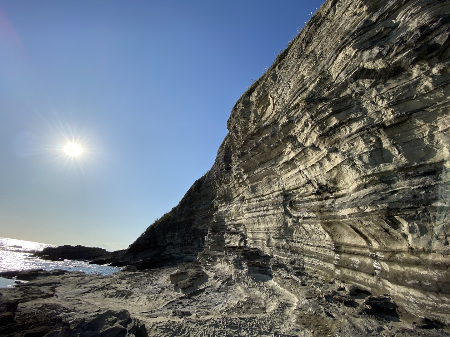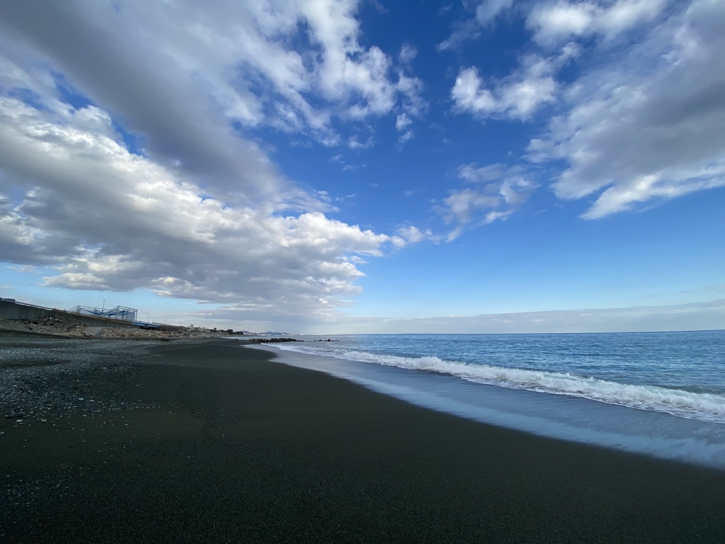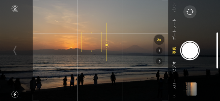 江ノ島でのカットのスクリーンショットですが、まずは上のグリッド線、次は下のグリッド線というように水平線を合わせてシャッターを切りました。こうするだけで微妙な構図にならず、締まったカットになるのでオススメです。また、スマホを縦位置に構え直して、同様にグリッド線に合わせたカットを撮影するのもアリです。