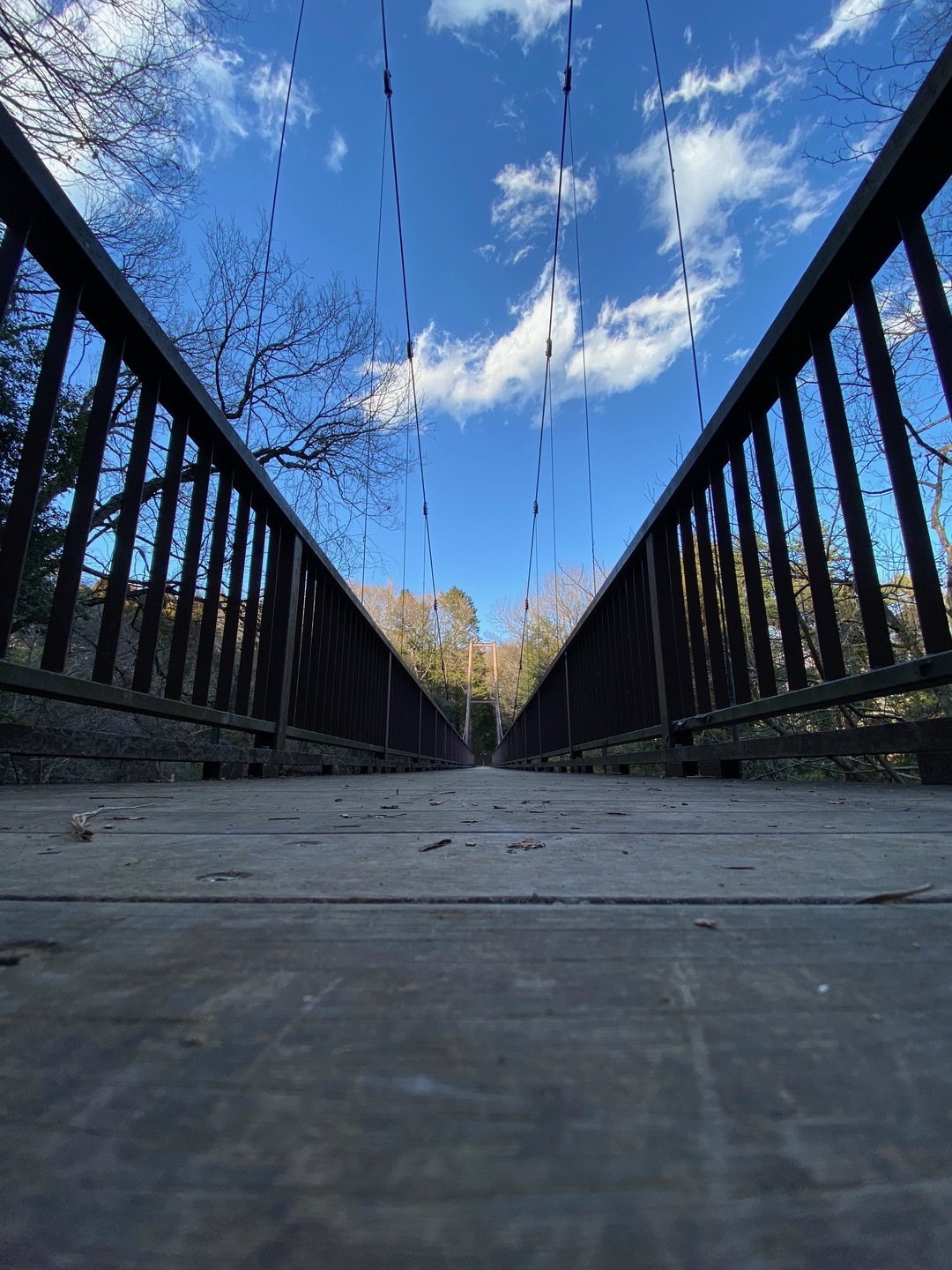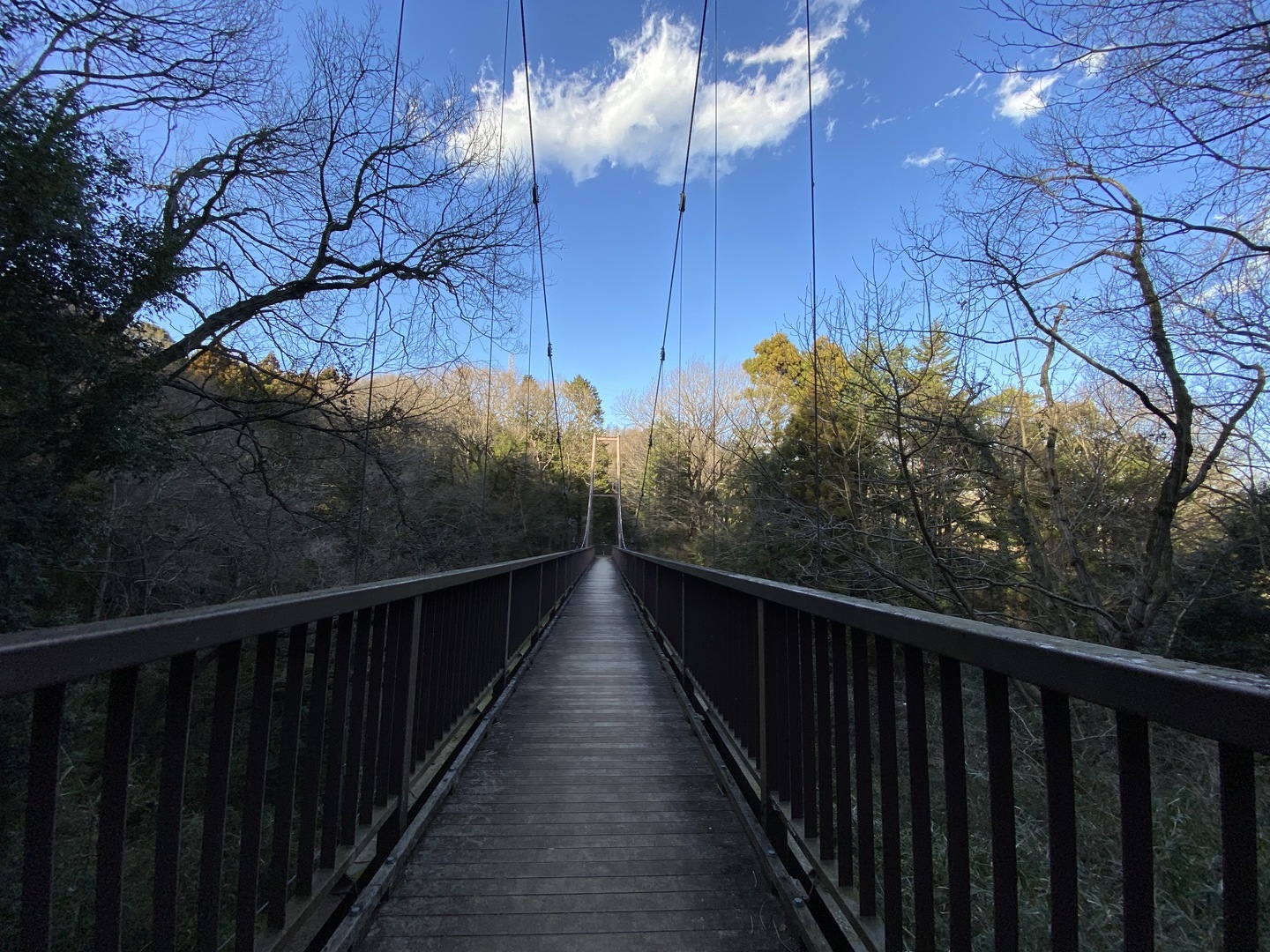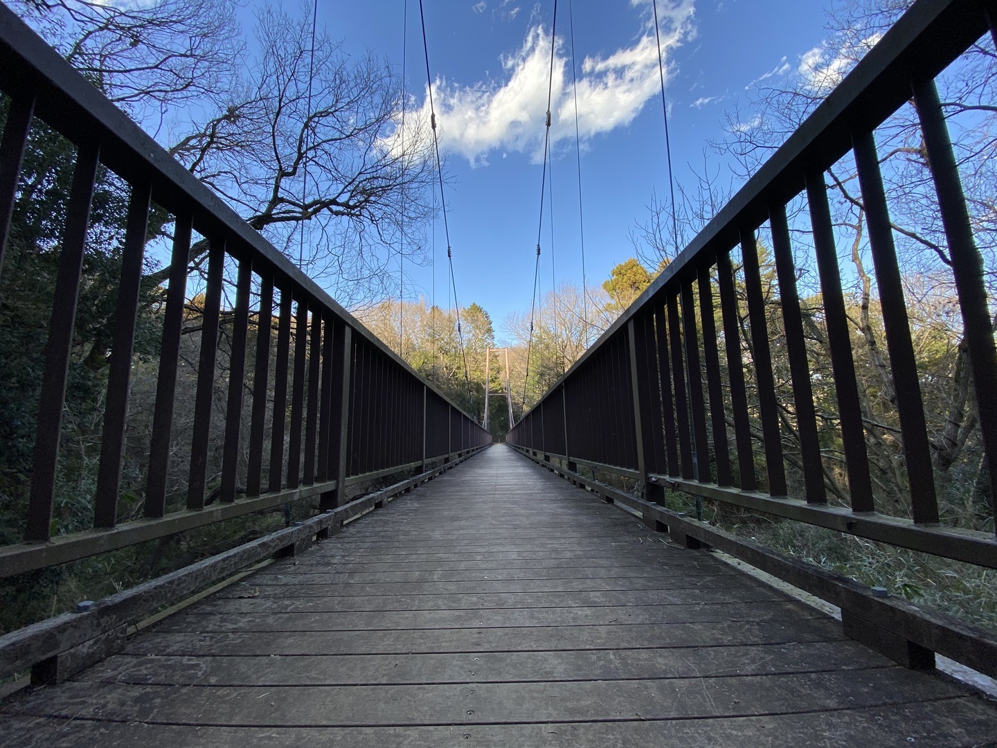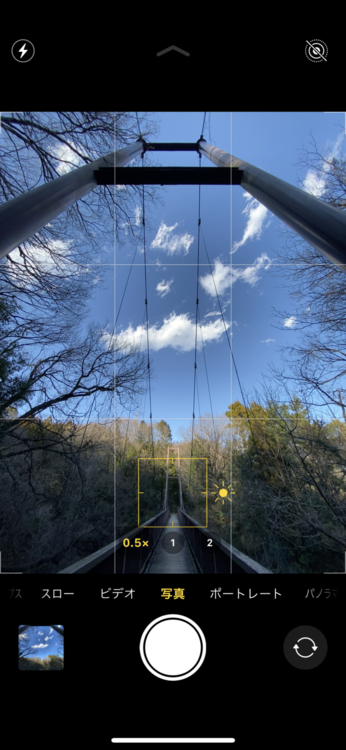 そして、アングルを変えてみましょう。吊り橋でのカットですが、撮影する場所が同じでも、スマホの高さが変化するだけで画面構成が大幅に変化することがわかります。また縦位置か横位置の撮影かによっても同様なのがお分かりいただけるでしょう。ディスプレイ内に展開する風景のバランスを変化させて撮ることによって、見る人の印象を大きく動かすことが可能なのです。