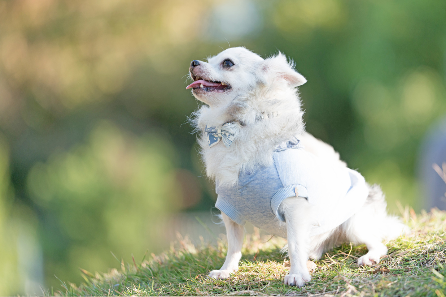 屋外でのワンちゃんも室内同様に、できるだけワンちゃんの目線までカメラを下げて撮影してみましょう。ワンちゃん目線までカメラアングルを下げ、望遠レンズを使って撮影することで、被写体であるワンちゃんと背景までの距離が確保出来て、大きなボケを演出することが可能になり、ワンちゃんをひき立たせることができます。