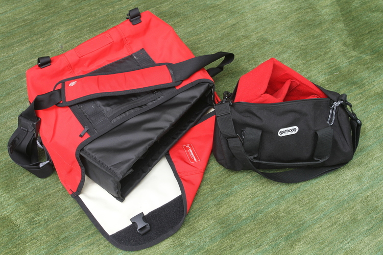 TIMBUK2のメッセンジャーバッグには、「エツミ クッションボックスフレキシブルL ブラック E-6123」を、OUTDOOR PRODUCTSのミニドラムバッグには、「ハクバインナーソフトボックス TYPE-B(現行品ではハクバ インナーソフトボックス 300に相当)」を組み合わせて使っていました。