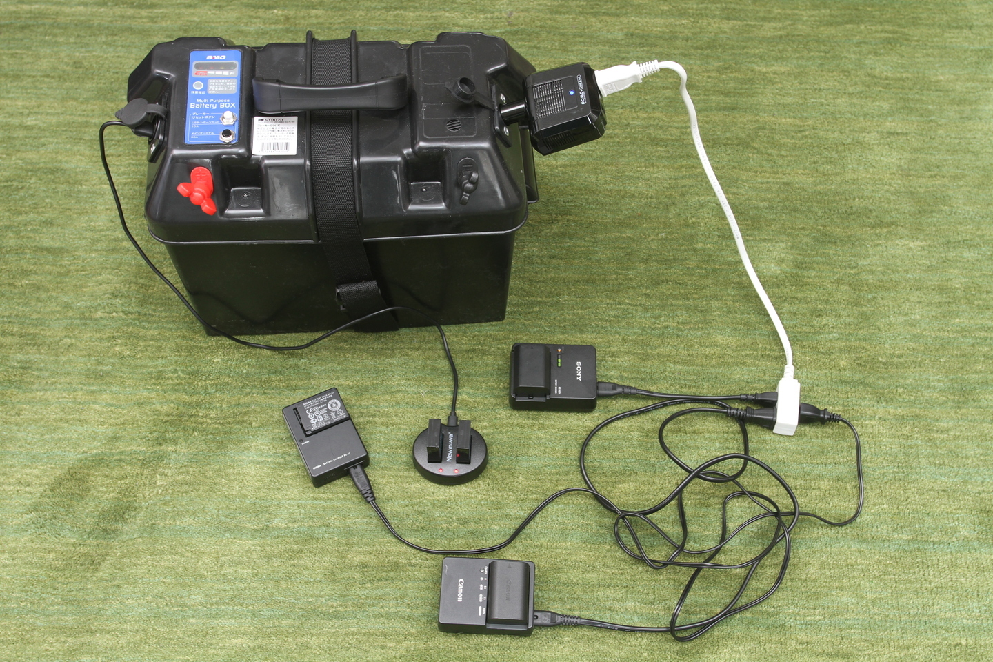 カメラのバッテリーを大量に用意して、撮影期間中のバッテリーは出発前に用意しておくという方法もあるのですが、私の場合、レビューやテストの機材がそのときごとに異なることも多く、専用バッテリーが1個しか手元にないことも多いので、クルマのなかで充電が行えるように大型のサブバッテリーを用意しておき、逐次充電しています。