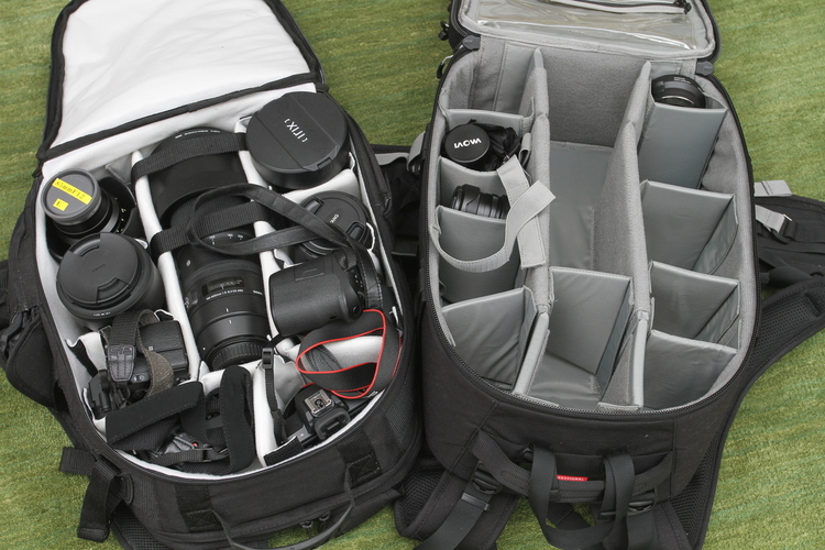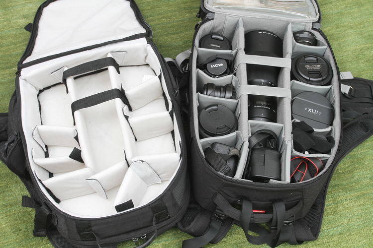 写真をみてもらうと一目瞭然なのですが、容量23Lの「tamrac Anvil 23」から収まっていた機材を「Amazonベーシック カメラリュック 一眼レフ用 ラップトップ収納可 22.8L」に移すと、まったく収納しきれません。9本入っていたレンズのうち、小型の3本とマウントアダプターが入り切りませんでした。