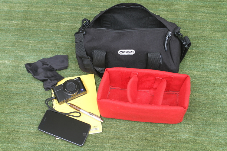 しかし、夜中に到着した道の駅の様子を撮影しておきたいといったときには、高ISO感度でのスマホの画質では十分でなかった体験があり、スマホに比べると大きな1インチサイズの撮像素子を採用したSony Cyber-shot RX100 IIIを入れています。また、コンパクトデジカメと財布やスマホなどをいっしょに入れられるので、撮影の途中にコンビニで買い物をするなどの日常的なサブバッグとして便利なわけです。