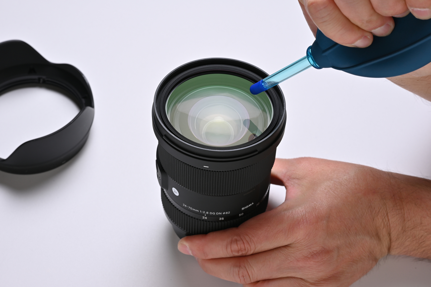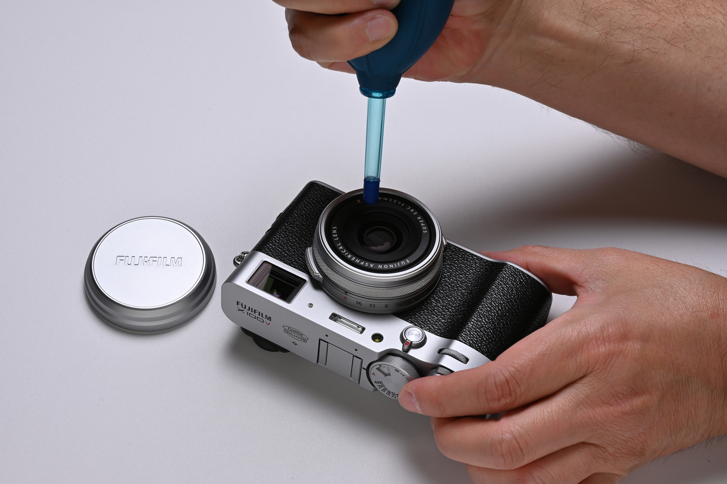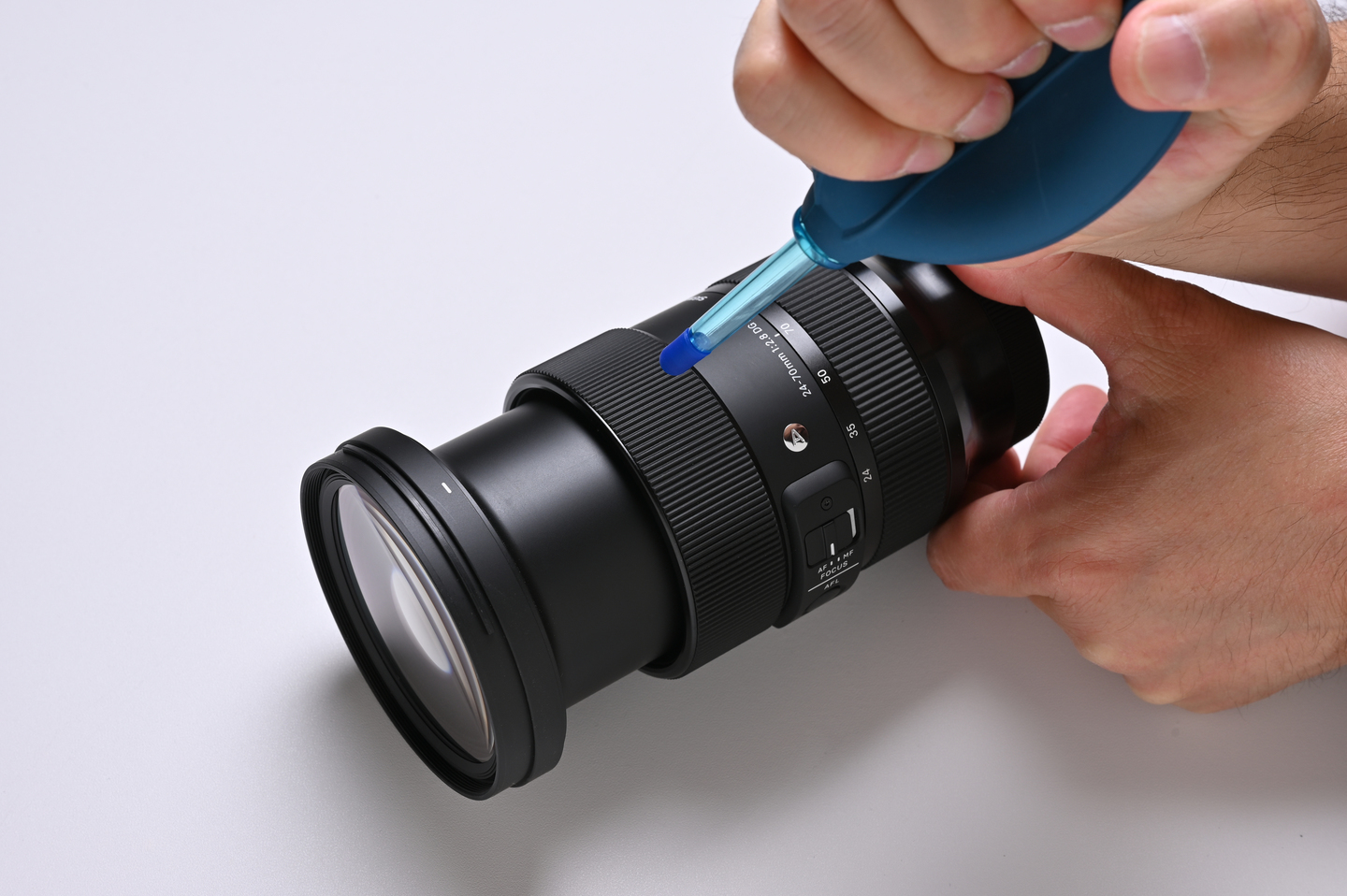 次はレンズ部分のお手入れです。フィルターを装着している場合は外します。まずは被写体に向ける「前玉(まえだま)」からキレイにしましょう。これもブロワーでホコリをまず吹き飛ばします。もしホコリが残っていた場合、クリーニングペーパーで拭いて傷をつけてしまう恐れがあるからです。