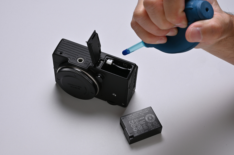 バッテリーやメモリーカードもボディから外し、スロットの奥や接点部分にホコリが残らないようにブロワーで吹きます。三脚穴にも何か入っていないかチェックを忘れずに。