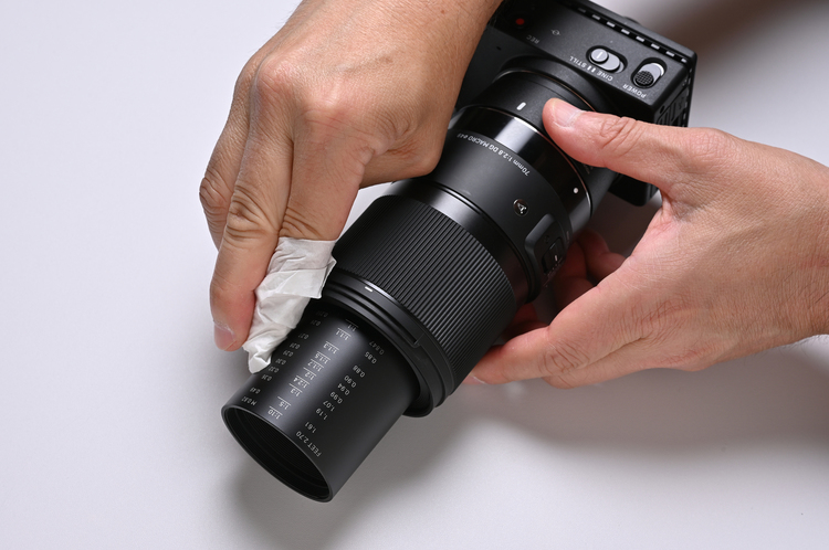 今度はレンズの前玉、後玉をクリーニングペーパーで拭き上げます。クリーニングペーパーを指先に巻き、レンズの中心部からゆっくりと円を描きながら外側に向かって拭いていきます。あまり力を入れず、優しくレンズの表面を撫でていくようにしましょう。クリーニングペーパーのアルコール薬剤が拭きむらとして残らないように、慎重に円形に拭いていくことが大事です。