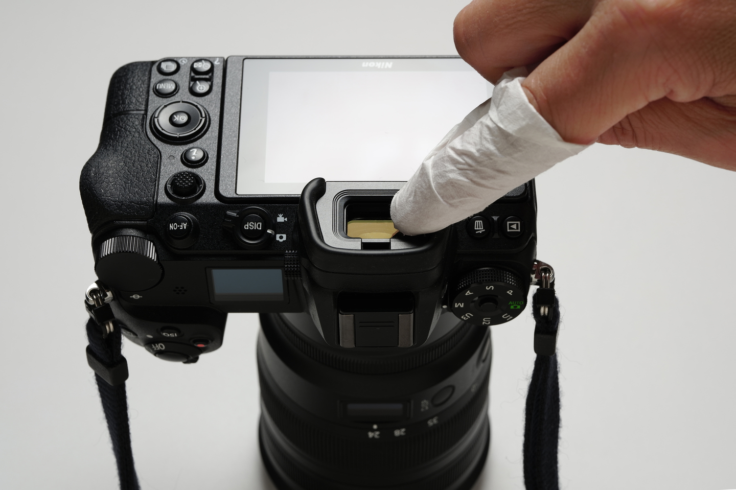 お使いのカメラにEVF(電子式ビューファインダー)が搭載されている場合は、その接眼部もクリーニングペーパーでキレイにしましょう。アイカップが脱着できる場合は外してカメラボディ側を拭き上げましょう。アイカップにガラスが装着されている場合はその表面、裏面ともにブロワーをかけたあとクリーニングペーパーで拭きましょう。