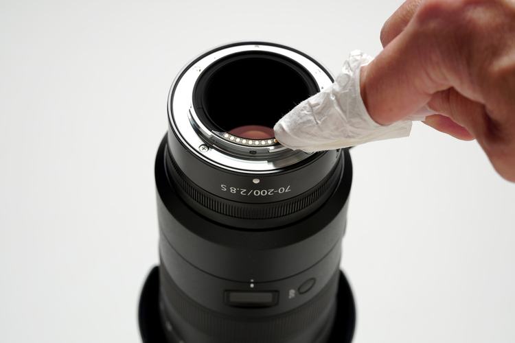 オートフォーカスレンズには後玉周辺にボディと様々なやりとりをするため「電子接点」があります。ここが汚れると動作不良の原因になりますので、この電子接点もクリーニングペーパーで軽く汚れを落としておくといいでしょう。