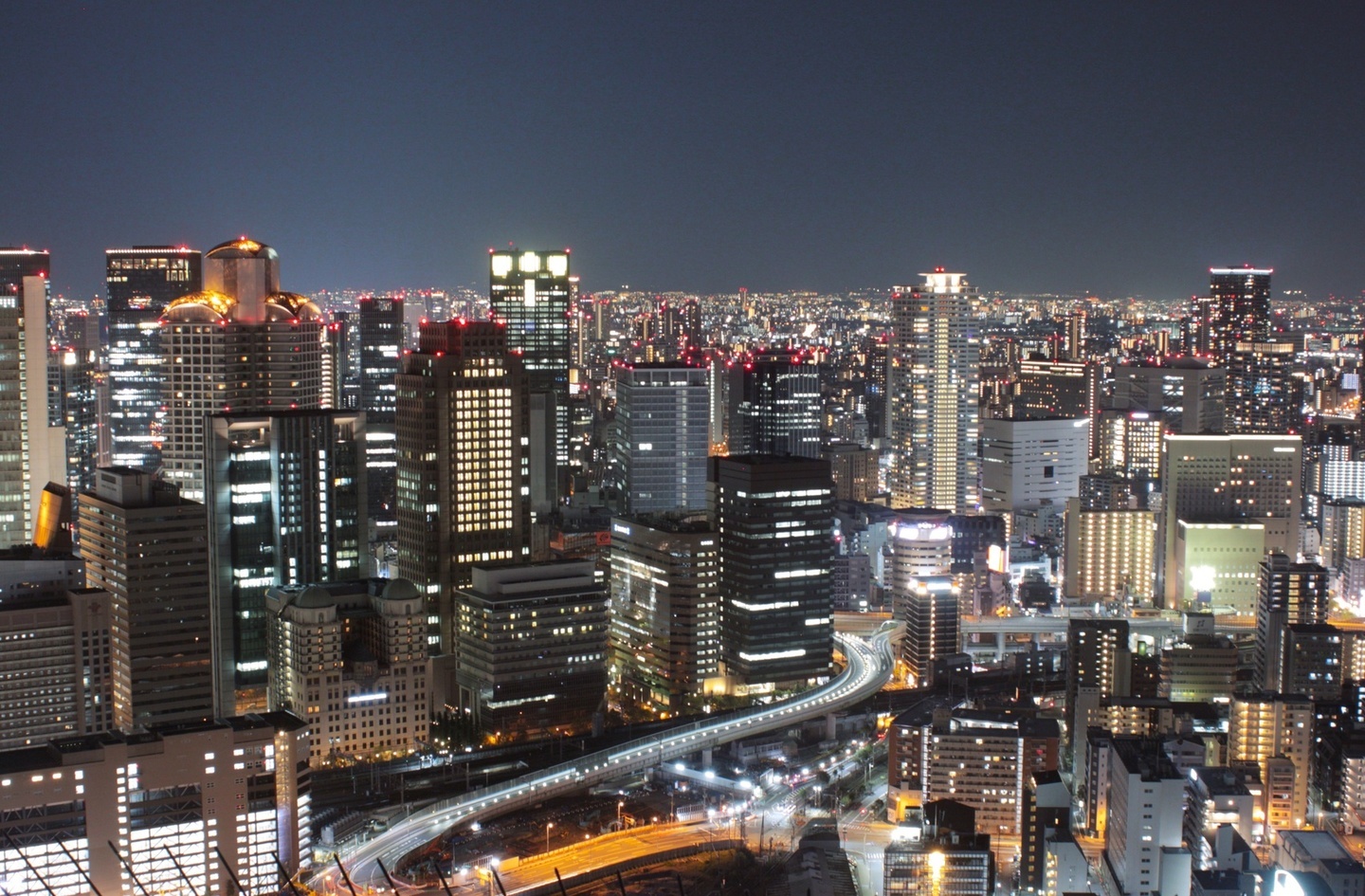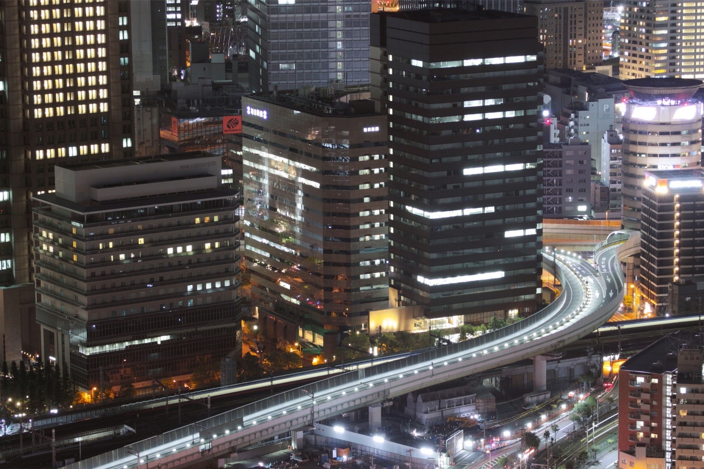 大阪駅周辺のビル群の下層階を切り取り、手前には流線型の高速道路を取り入れました。シャッタースピードを6秒にしているので、車の軌跡が撮影できています。