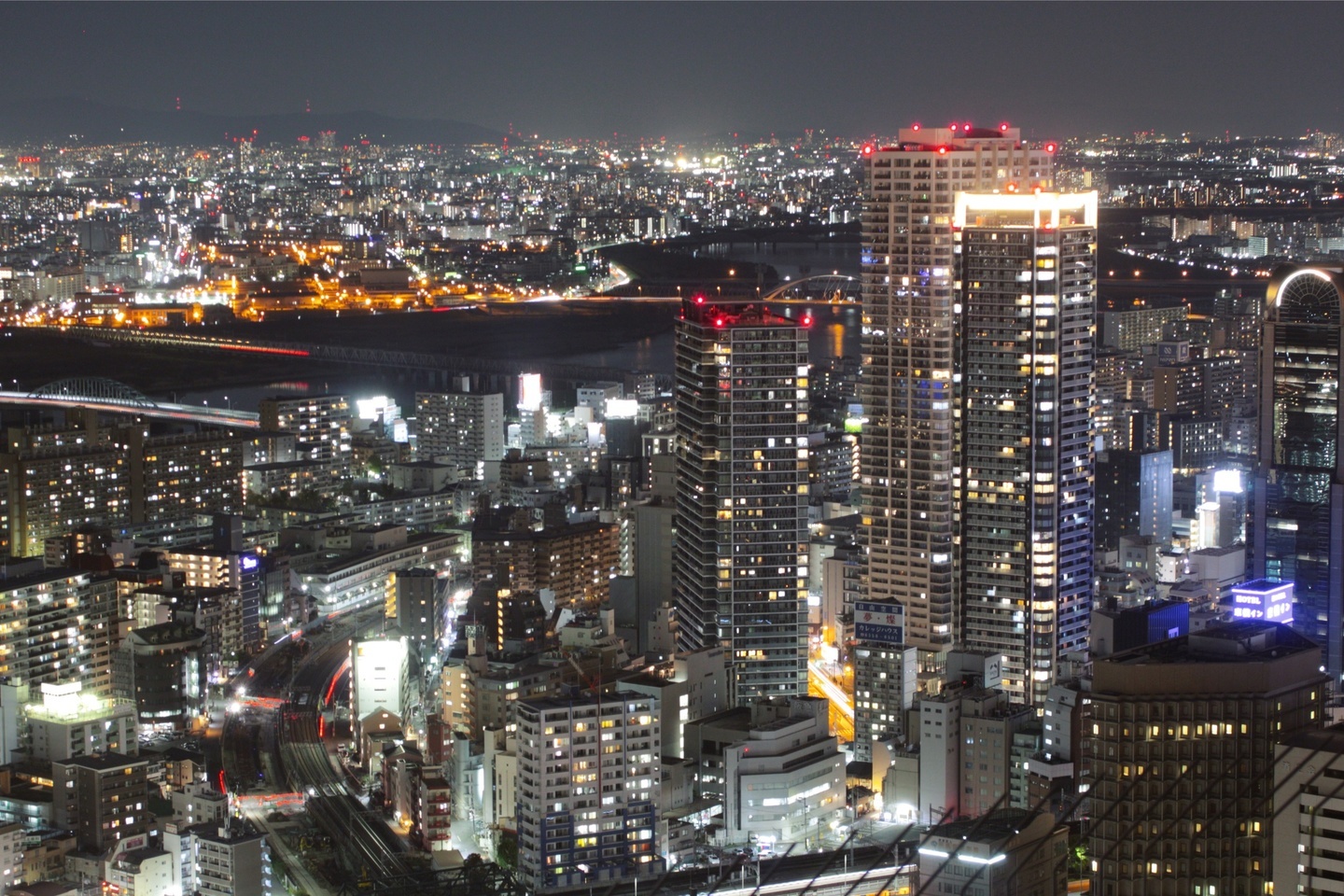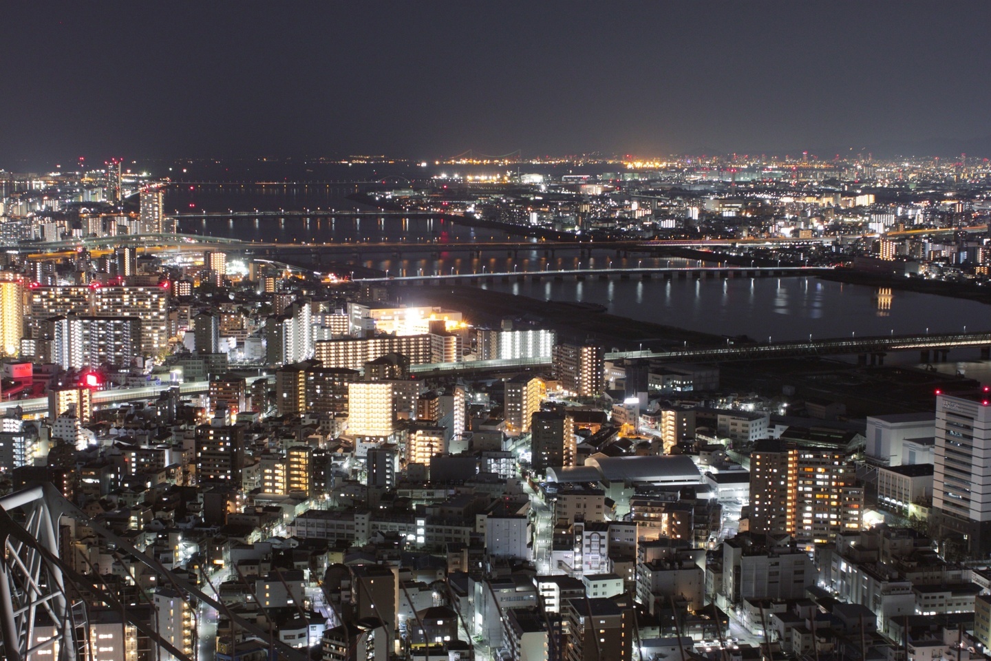 マニュアルモードで撮影大阪市北区にある梅田スカイビルの展望台「空中庭園展望台」から、淀川を撮影しました。淀川を真ん中に写真の奥に配置して、手前には住宅街のまばらな明かりを入れました。
