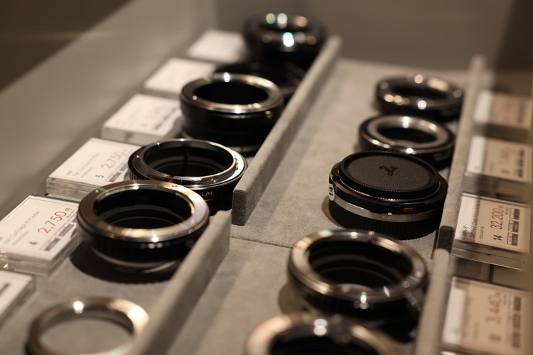 オススメポイント二つ目は、「マウントアダプター体験コーナー」です。各メーカーの様々なレンズマウントをお試しいただけるコーナーとなっておりまして、写真の通りマウントアダプターの数を沢山ご用意しております。中古カメラフロアには多くのオールドレンズとカメラがございます。様々な組み合わせでの試写ができる当コーナーに、ぜひお立ち寄りください。