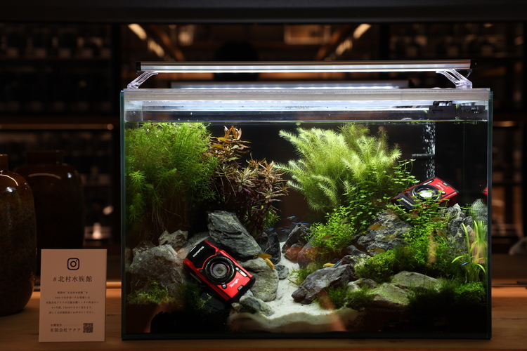 中古フロアには筆者おすすめポイントが二つあります。一つ目は「#北村水族館」です。写真を見て頂ければ一目瞭然ですが、カメラが水槽の中に入っています…ここのブースでは防水カメラを水中に入れて実写体験ができます。防水カメラを購入前に、実際に水に入れてどんな使用感か?どんな写真が撮れるのか?が確認できるキタムラ初の試みです。ただ入れて撮るだけでなく、ライトアップされた水槽の中を撮影できることから、#北村水族館と名付けています。