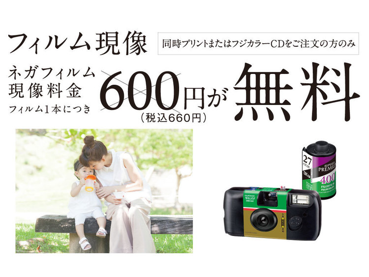 ネガフィルム現像料金フィルム1本につき、600円(税込660円)が無料