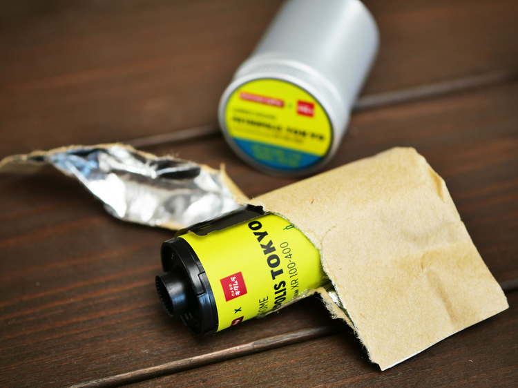 パッケージを空けてみるとオリジナルの缶ケースが入っている。ケースはアルミ製で高級感がある。気密性に優れ何度でも使用できるので使用後もフィルムケースとして使えるので嬉しい。アルミケースから出してみると、フィルムは紙袋に入っているのでオシャレだ。フィルムを出すだけでモチベーションが上がるのはロモグラフィーらしい。フィルムにはDXコード※がないので自分でISO設定することになるので注意が必要だ。