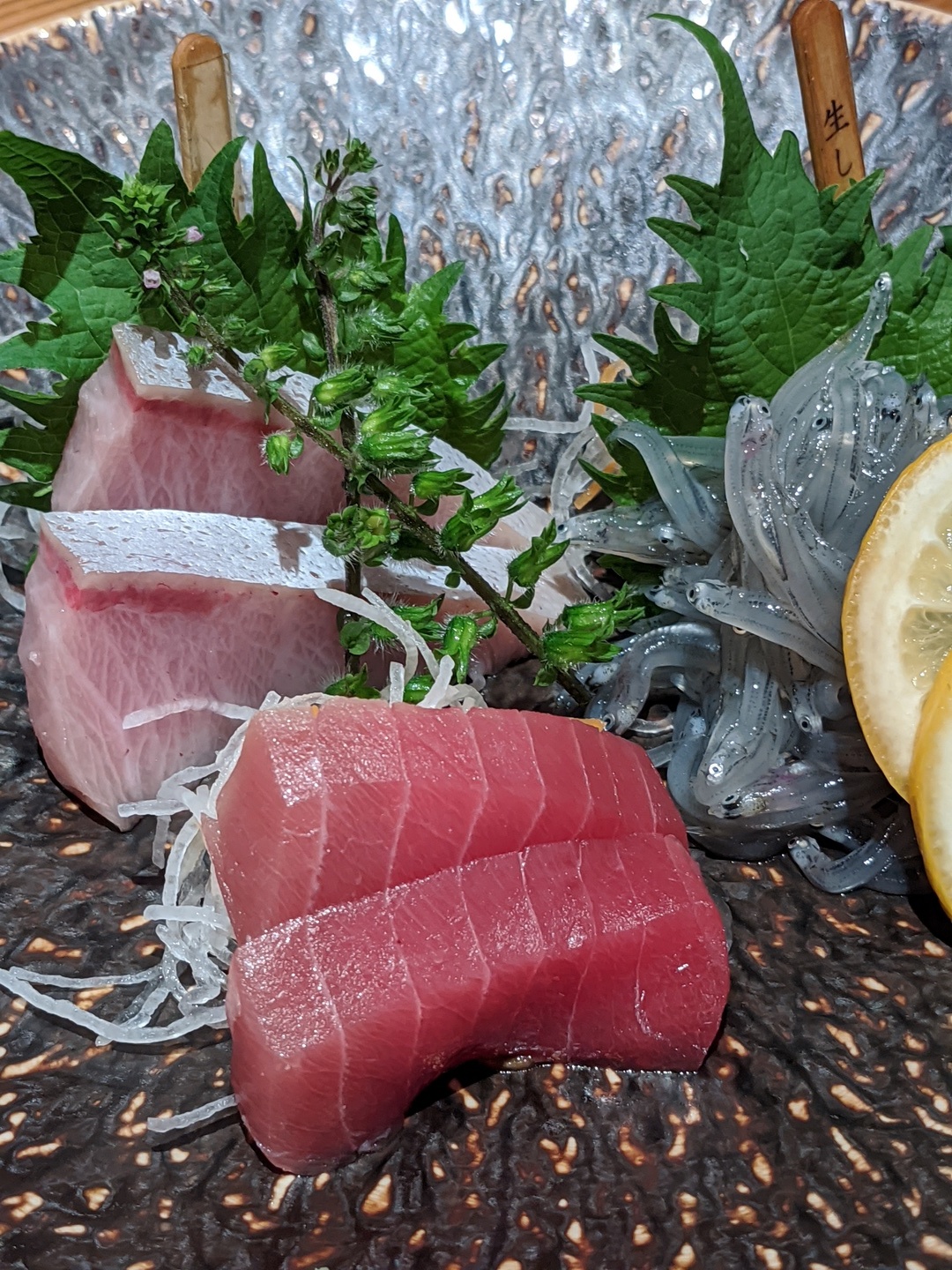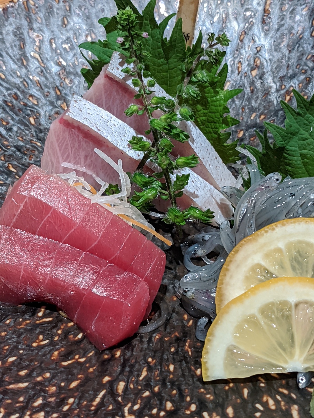 新鮮でプリプリしたお刺身も見る位置をちょっと変えるだけでこんなに「シズル感」が違って見えます。座ったままでもお皿を回転させるだけで印象が変化しますよ