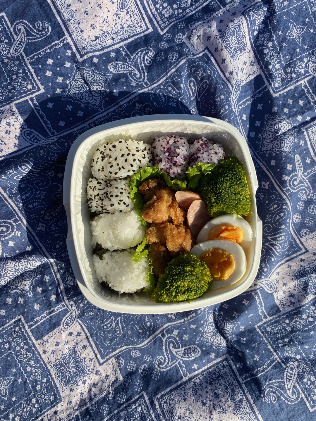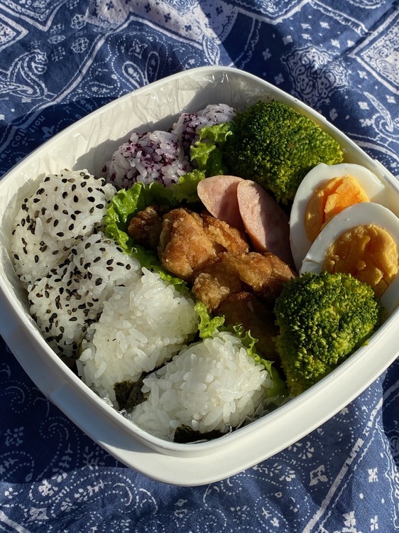 斜めからお弁当を撮りました。おにぎりとおかずの配置がよくわかりますね