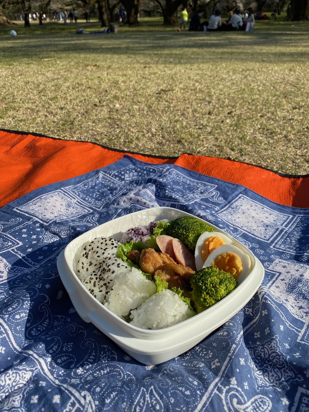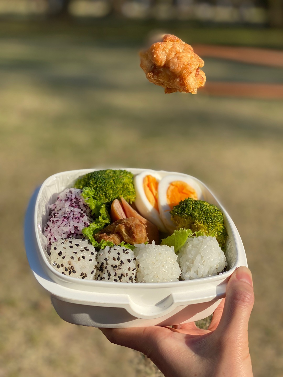 遠足や旅行などの場合は背景を写し込むようにすると「あ、あそこで食べたんだな」と場所の記憶がすぐ蘇ってくる写真になりますよ。主役はお弁当ですが、行った場所を脇役として写し込むというわけです