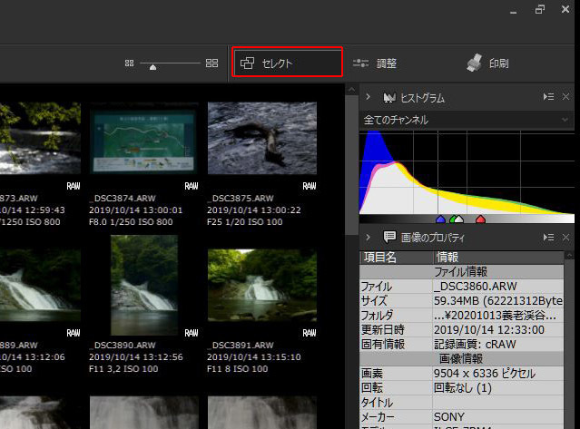 初めてソフトを使う時、戸惑うのはたくさん並んでいるメニューの数々やアイコンの数です。たくさん並んでいるので、それだけで難しそうな感じがしてきますね。まずはソフトを立ち上げたら画面右上の項目の「セレクト」をクリックして、現像したいRAWデータが格納されているフォルダを選びます。フォルダ内のRAWデータのサムネイルが一覧で表示されます。サムネイルの大きさを変えるには横にあるスライダーで調整する事が可能です。
