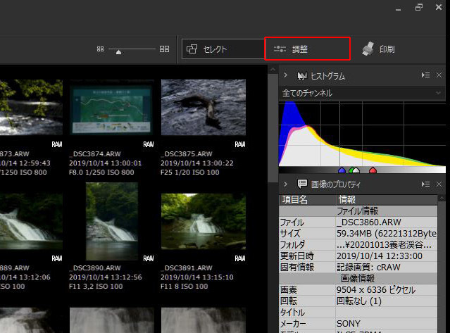 ここからRAW現像の本番です。RAW現像する画像を選んだら、画面右上の「調整」をクリックし現像モードに変更します。