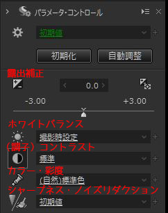 SILKYPIXでは現像の調整を、露出補正、ホワイトバランス、調子(コントラスト)、カラー(彩度)、シャープ・ノイズリダクションの順で進めていくことを推奨しています。この調整の順番に沿って調整がしやすい様、パラメータ・コントロールには各調整項目が上から順番に配置されています。