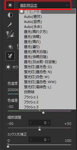 例えば「ホワイトバランス」項目のプルダウン▼をクリックすると、「SILKYPIX Developer Studio Pro10」でプリセット登録されているホワイトバランスの設定項目が表示され、簡単に選択することができます。または、サブコントロールが表示されるので個別に色温度を細かく設定する事も可能です。