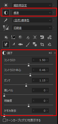 調子(コントラスト)では、サブコントロールでコントラスト調整・ガンマレベル・黒レベル・明瞭度・かすみ除去の調整ができます。