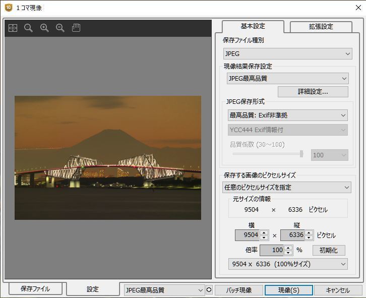 一通り現像の調整ができ作品ができあがり、JPEG・TIFFデータなどに出力する場合は上部にある「現像(D)」→「一コマ現像(S)」を選択し保存場所を決めて「現像(S)」をクリックすれば作品の出来上がりです。