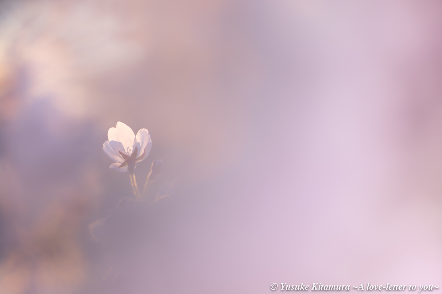満開のソメイヨシノの中で、夕陽に照らされた一輪を見つけました。4月上旬、17:30過ぎのとても光が綺麗なゴールデンタイムに逆光で撮った一枚です。開き切っていない花なので、このように後ろから撮っても形の良さが伝わります。花びらが透けている部分や重なっている部分、シベのシルエットの美しさなどが逆光で撮ったことにより際立っています。