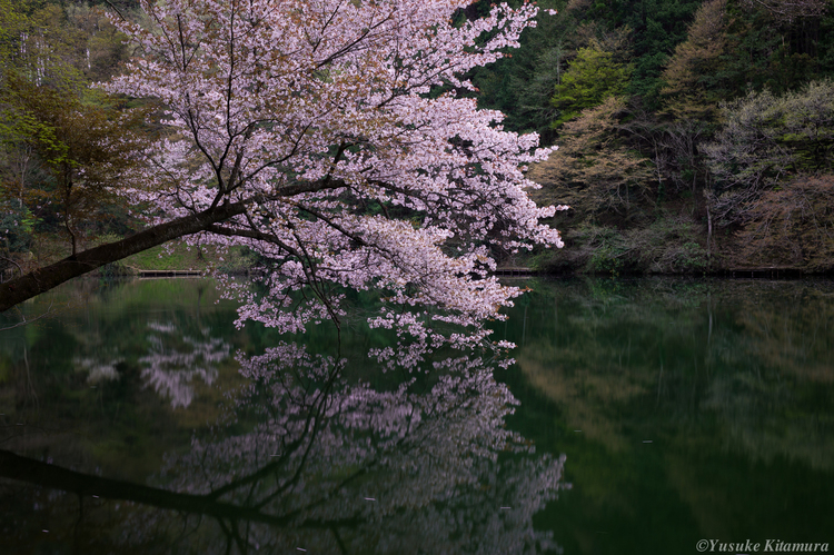 山奥に佇むソメイヨシノ。湖面に映る桜も綺麗に写したかった為、三脚を使いシャッタースピード4秒で撮りました。長めのシャッタースピードで撮ることにより、湖面に反射した桜もしっかりと写ってくれました。露出は少し暗めにし、桜のピンクが際立つよう心がけています。