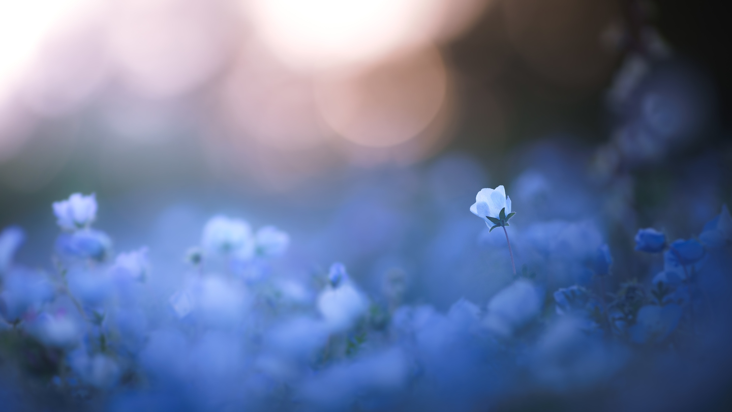 また、明暗差が大きいシーンで撮影した写真は、可能であればハイライト部とシャドウ部だけでもレタッチすることをおすすめします。撮って出しだと、ハイライト部とシャドウ部の階調を両立させることが通常よりも難しいためです。そして、この時の光はオレンジ色を多く含んでいたため、ホワイトバランスをカスタムで4100ケルビンまで下げ、ネモフィラとその周りの色がイメージ通りになるように調整しました。それにしても雨上がりの夕暮れの中で撮る花は、また一段と綺麗ですよね。そう何度もあるシーンではありませんが、タイミングが合えば是非狙ってみてください。