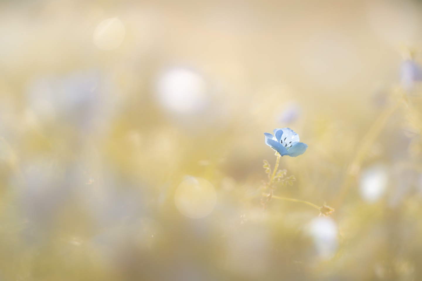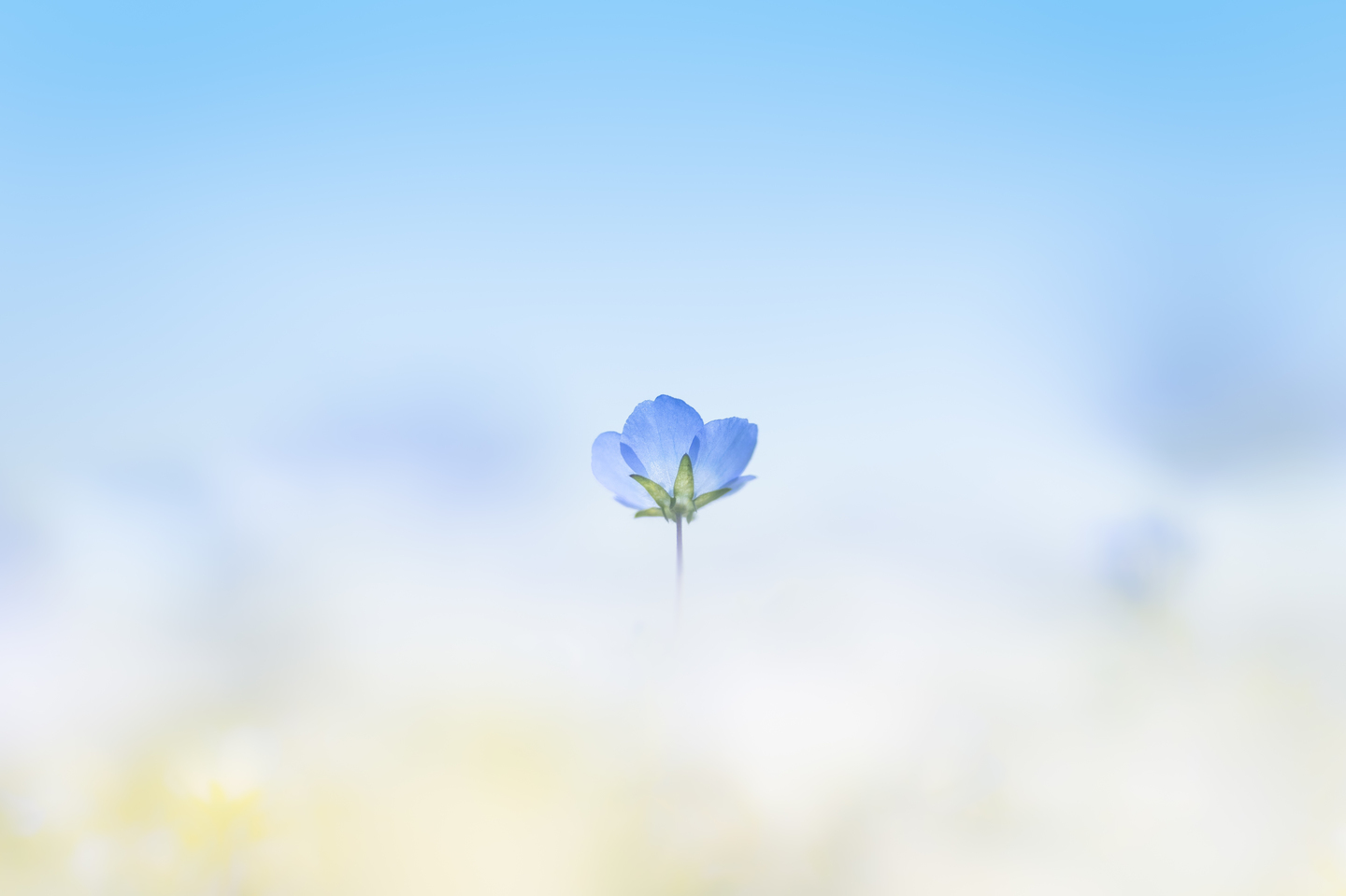 満開のネモフィラ畑で可愛らしい形をした一本を見つけました。前ボケの部分は元は青一色のネモフィラなのですが、主役とのメリハリをつけるために、青と相性の良い黄色をレタッチで足しました。青空の色もネモフィラととても似ていたため、レタッチで少し変えました。