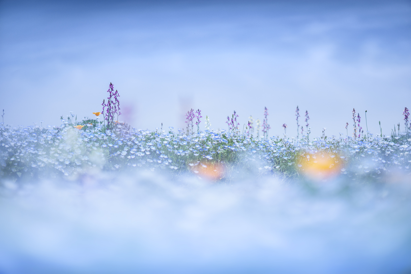 今度は満開のネモフィラ畑を、引いて花畑として撮ってみました。オレンジのカリフォルニアポピーの前ボケがいいアクセントとなってくれました。前ボケと後ろボケが青一色で単調だったため、周辺光量落ちの補正をオフにし、四隅を暗くしてムラを作りました。開放で撮った花の写真はボケの部分が多いため、単調になってしまうことがしばしばあります。そういう時、周辺光量をわざと落としてムラを作るとグラデーションが生まれるので、機会があれば是非やってみてください。撮影後、補正オンへの戻し忘れには注意です。