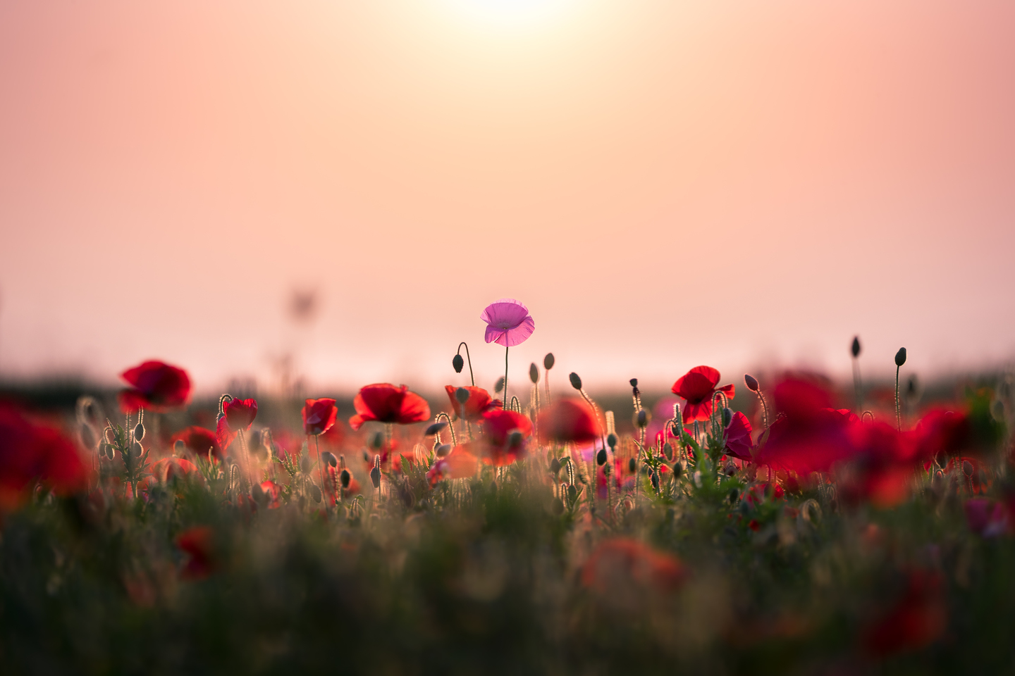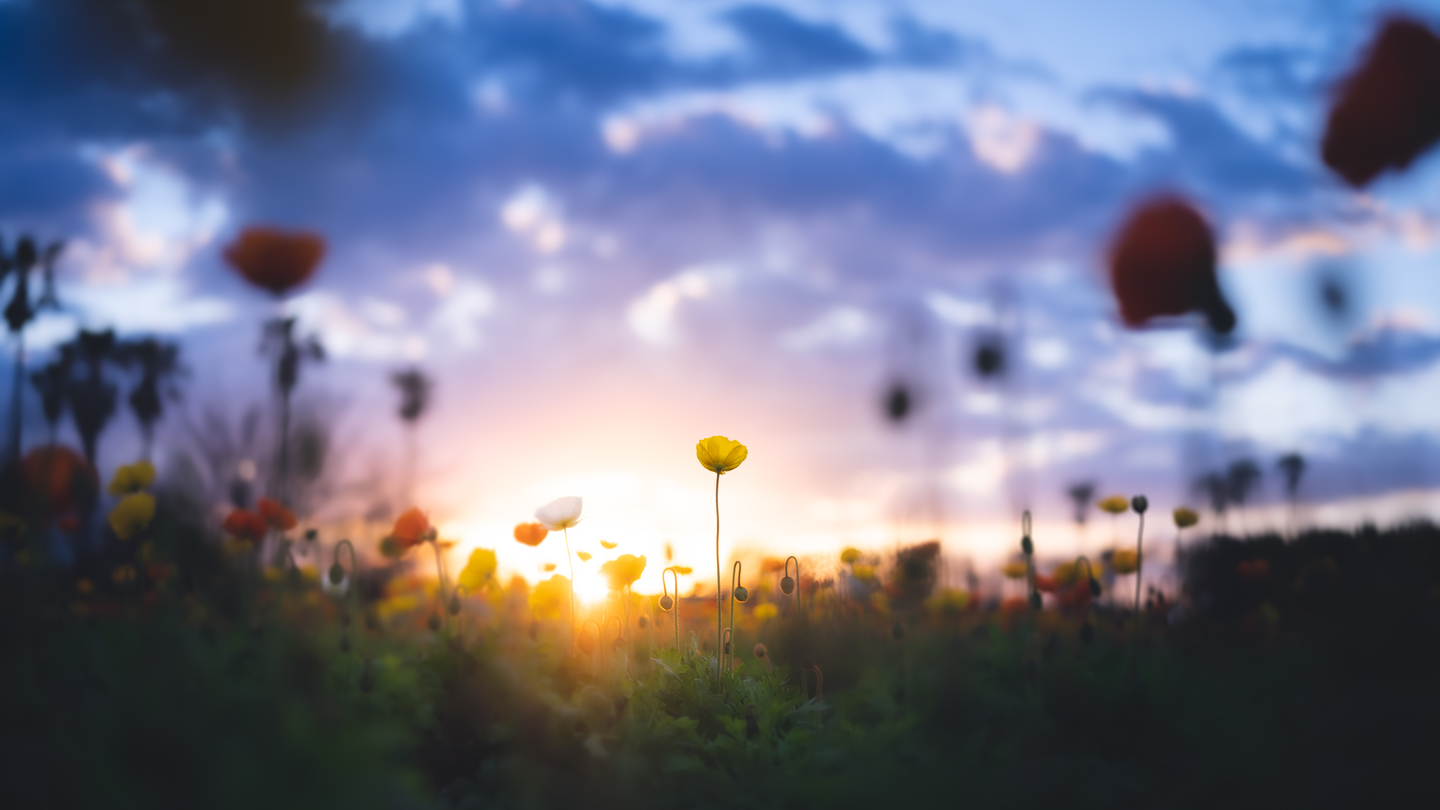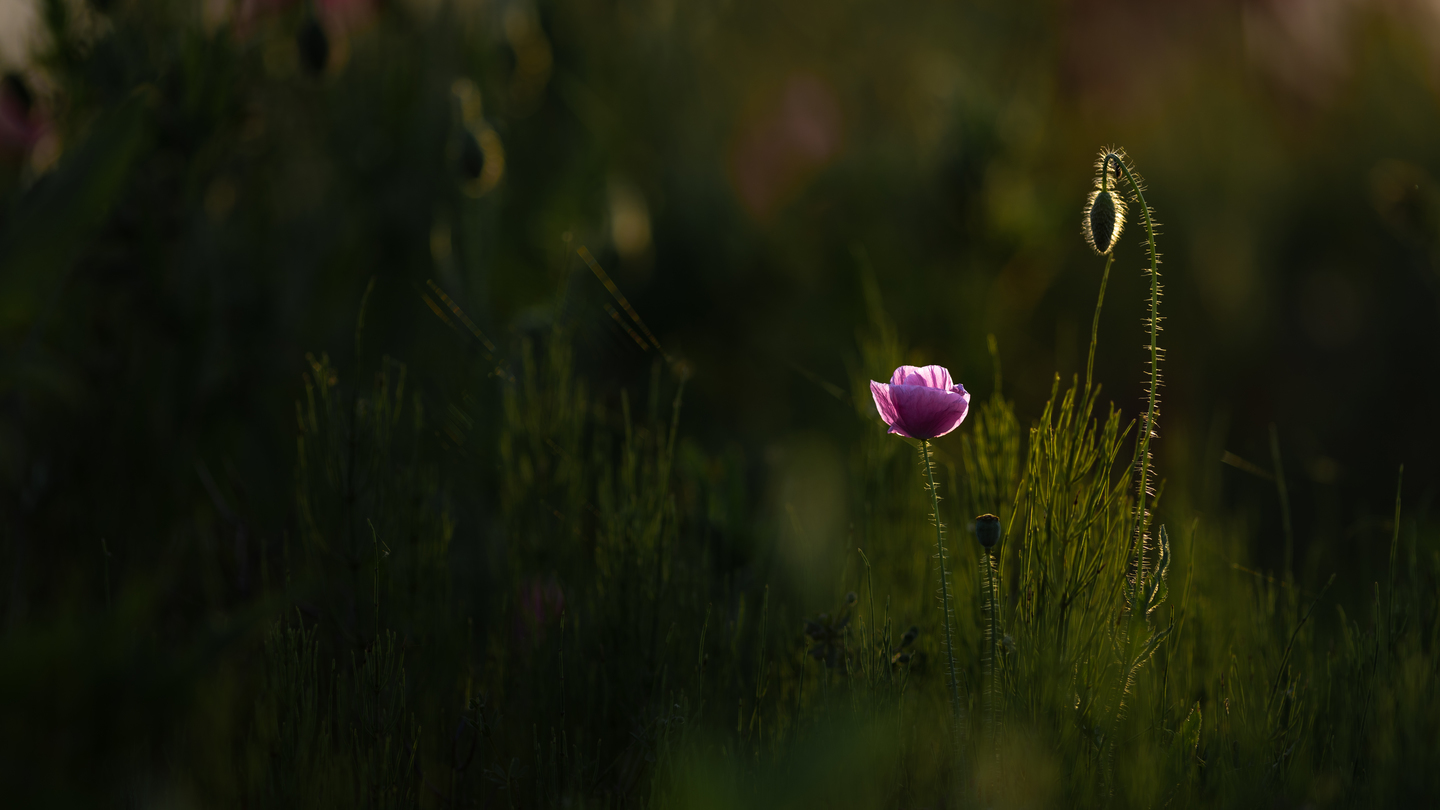 満開のポピー畑の端っこで、つぼみと会話しているかのような一本を見つけました。花とつぼみが会話しているイメージを最優先にしたかったため、ベストなアングルやボケを少し犠牲にして、余計なものは入れない構図を選択しました。露出を大きく下げて、光が当たっている部分をわかりやすくし、ストーリー性を強調しました。露出を下げて花を撮る際は、光が当たっている部分以外は見えなくなってしまうくらいに下げるのがおすすめです。