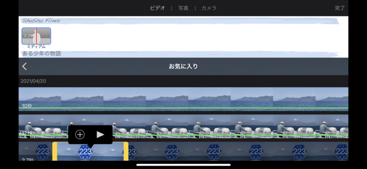 目星をつけたムービーを選んでタップします。すると「+」と「再生」アイコンがポップアップします。「+」アイコンを選ぶとムービーがテンプレートに挿入されます。「再生」アイコンを選ぶと縮小表示されたムービーが再生され、内容を確認することができます。また、この時指先で左右にドラッグして、挿入する位置を指定することもできます。