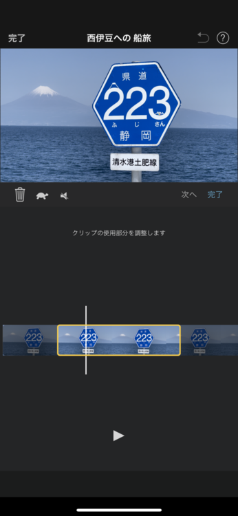 挿入したムービーをタップすると、挿入範囲の調整、「亀」アイコンでスロー再生、「スピーカー」アイコンで音声の有無を指定できます。