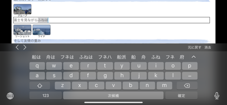 ムービーだけでなく写真を挿入することも可能です。もしムービーが足りなくなったら写真を使うのもいいでしょう。文字の部分はテキストの入力ができます。シーンにあった言葉をiPhoneで入力していきます。なかなか手間のかかる作業ですが、撮影時のことを思い出してやるとうまくいくでしょう。
