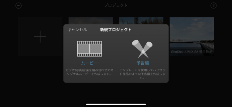 さあ、いよいよ編集作業です。使用するアプリはアップルの「iMovie」です。もしiPhoneから削除してしまった場合は「App Store」からダウンロードしましょう。もちろん無料です。「iMovie」アイコンをタップしてアプリを立ち上げましょう。「プロジェクト」画面にある「+」をタップすると下の画像のような画面になるはずです。表示のように「ムービー」と「予告編」の2種類を編集可能です。今回は「予告編」を制作します。