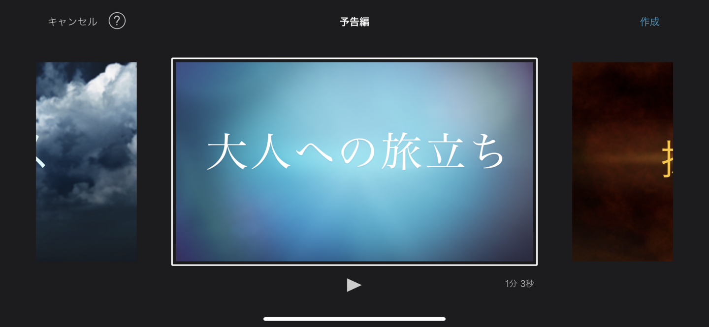 それでは「予告編」をタップしましょう。タップすると予告編のテンプレートがズラリと並んでいるはずです。「アドレナリン」「おとぎ話」「冒険旅行」などステキなタイトルが見えますね。気になったものを選択して三角印の再生アイコンをタップするとそれぞれをプレビューできます。撮影したムービー素材にマッチしたものを選んで、今回の予告編を作っていきましょう。今回は「大人への旅立ち」を元に話を進めます。