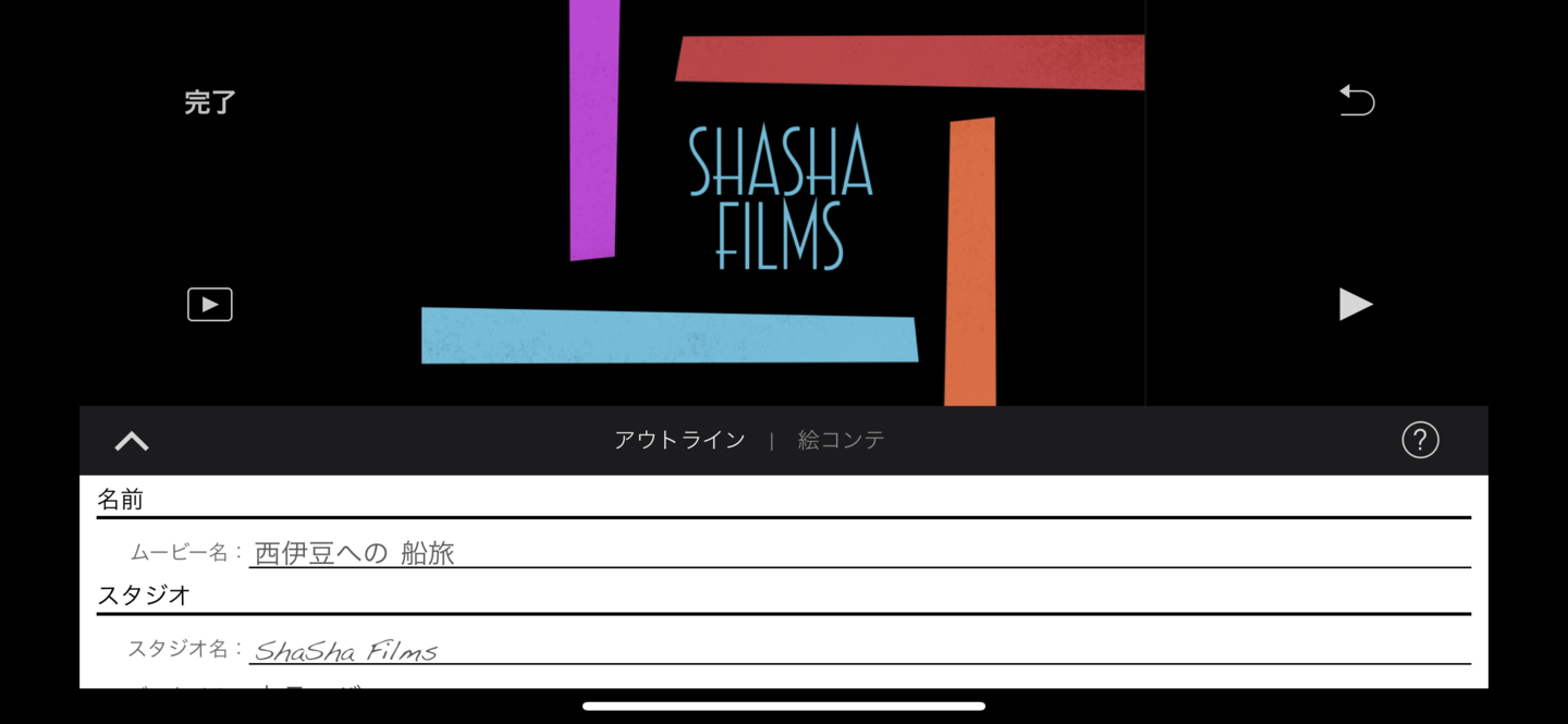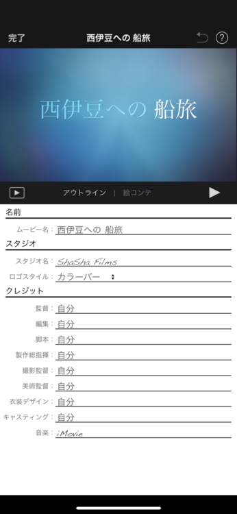 「アウトライン」ではムービーのタイトルやスタジオ名(作者名)、ロゴのスタイル(動く様子をプレビューできます)、クレジットなどを入力、指定可能です。ハリウッドの映画監督になったつもりでやってみるのがオススメ。