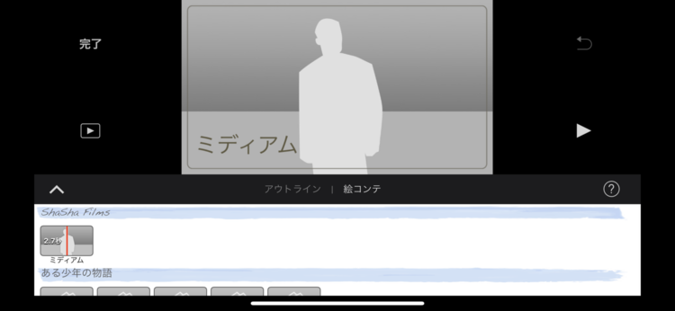 右上にある「作成」のアイコンをタップすると「アウトライン」と「絵コンテ」と書かれた画面になります。「アウトライン」はタイトルや作者名を入れたりすることができ、「絵コンテ」はテンプレートに沿ってムービーや写真、テロップを入れたりすることができるパートとなります。