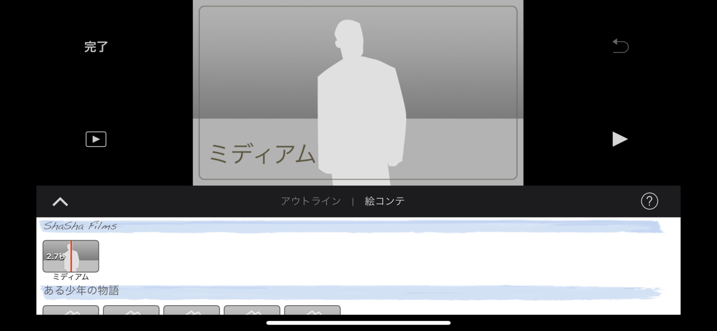 次は「絵コンテ」です。下の画像はから時系列順に素材をはめ込んだ様子であり、このようにテンプレートに沿って、ムービーや写真、テロップを挿入および入力するイメージで編集を進めていきます。とてもわかりやすいですよね。左の再生アイコンをタップすると大画面での簡易再生を、右にある再生アイコンをタップすると絵コンテ上でテロップなどが入ったムービーを再生可能です。