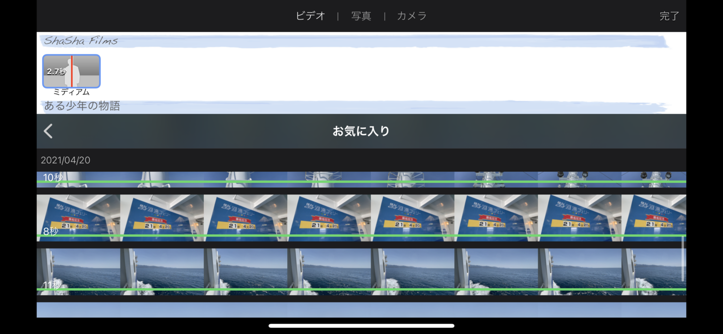 さて次は「絵コンテ」で編集していきましょう。テンプレートのアイコン(これを「クリップ」と呼びます)をタップして素材ムービーを選んで挿入していきます。この場合は「2.7秒」と書かれている部分に撮影したムービーを入れ込みます。秒数はクリップによって決められているので、この長さに合うものを選びましょう。