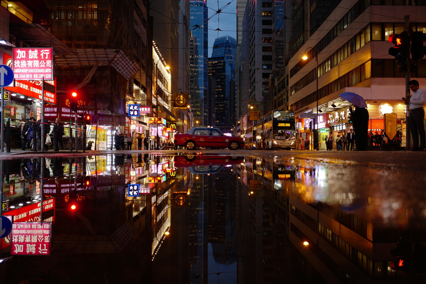 また、水たまりや建物の写り込みを利用して、シンメトリー構図を活用してみるのもおもしろいです。もう一つの世界が映り込み、幻想的でドラマチックな写真を撮影することができます。