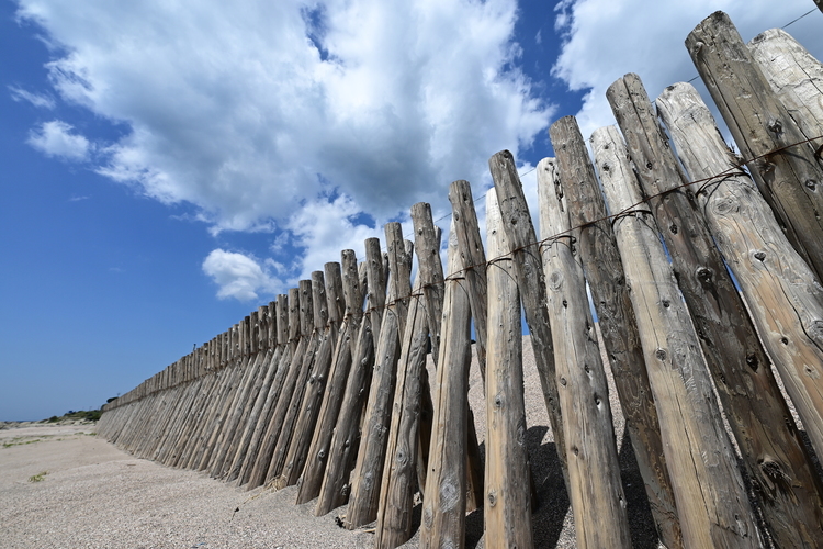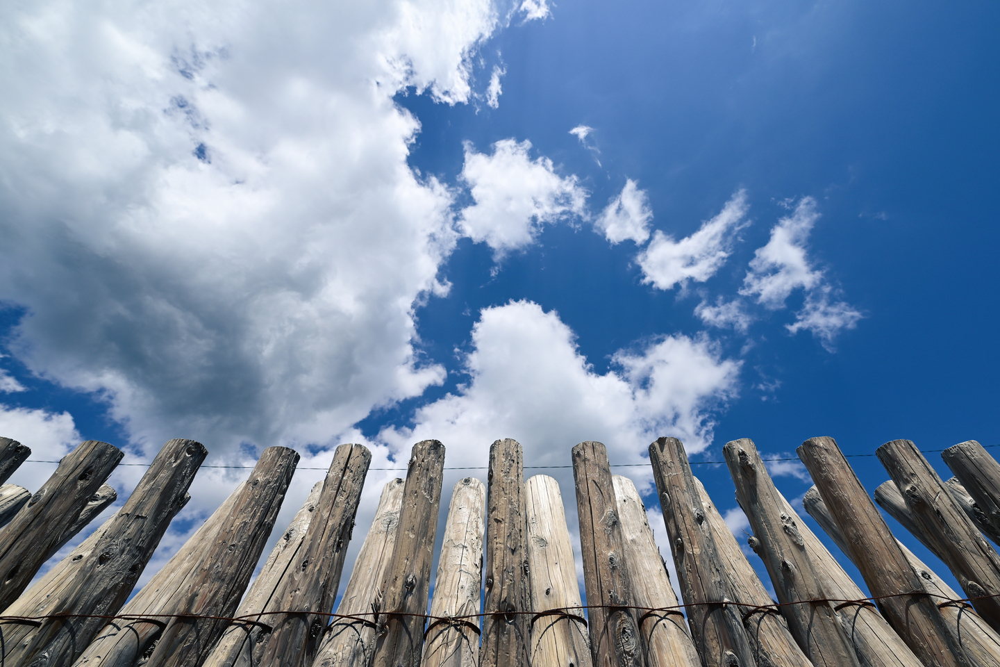三分割構図は二つの使い方があります。まずは分割した線上に被写体を配置する方法です。一枚目の写真は空と柵を2:1の比率で配置しています。そうすることで、柵よりも空や雲のダイナミックさを際立てることができます。三分割構図は2:1で二つ被写体をフレーミングするため、どちらか一方が際立ちやすくなります。