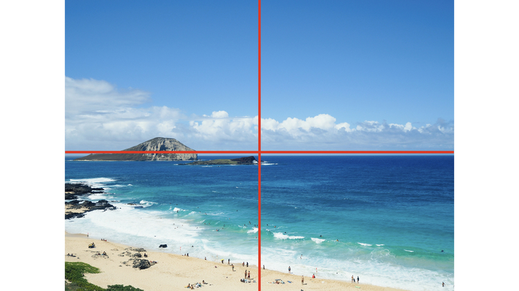 水平線や地平線を分割した線上に配置することで、空と水面、もしくは空と陸といったように、一枚の写真で二つの被写体を均等に際立てることができます。そのときに水平線や地平線が傾かないように水準器を使用して、線が水平になるように意識してみましょう。そうすることで、安定感が出やすくなります。