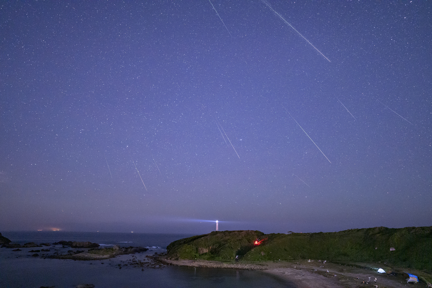 2つ目の流星の放射点方向を常に画角の中に収めるというものは、流星が降り注ぐような比較明合成写真を作りたい時のことを指します。流星群は、放射点と呼ばれる起点から四方八方に流れる特徴があり、ある一方向を撮り続けると、そこに写る流星はほぼ同じ方向から流れてきます。