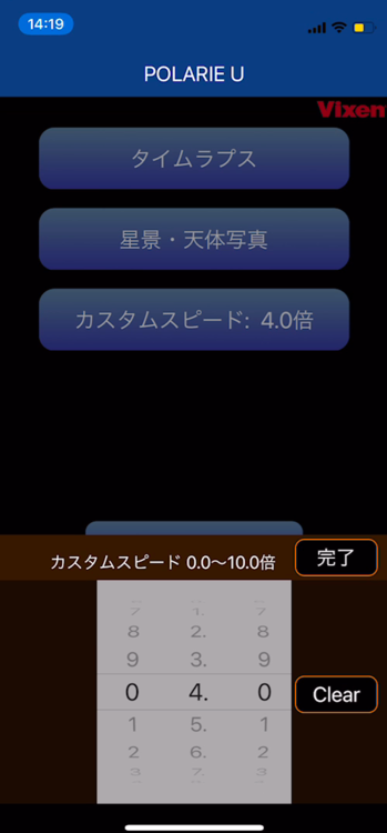月追尾は、皆既月食や部分月食の撮影、ISSの月面通過や、惑星食(月が惑星を隠す)の撮影などで使用します。カスタム速度は、0.0倍~10倍までの間で、0.1刻みで任意の速度を設定することができ、主にタイムラプス撮影で使用します。カスタム速度の設定は、ポラリエU専用のアプリ上で行います。