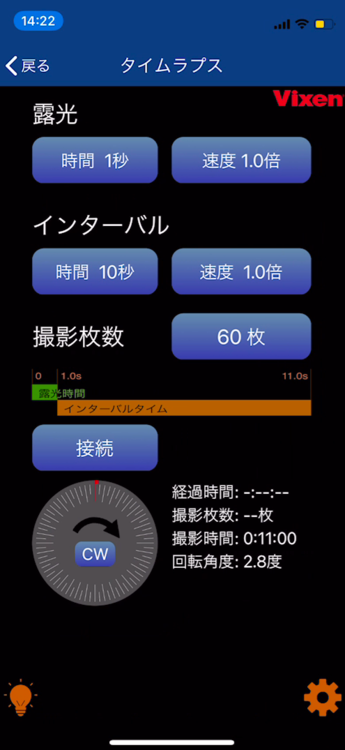 ポラリエUとカメラを別売のシャッターケーブルで繋ぐことで、専用アプリからシャッター制御をすることができます。露光中、露光停止中の回転速度や、回転方向、さらには撮影間隔、露光時間など、細かく設定することができるため、自分が理想とする動きのタイムラプスを撮影することができます。