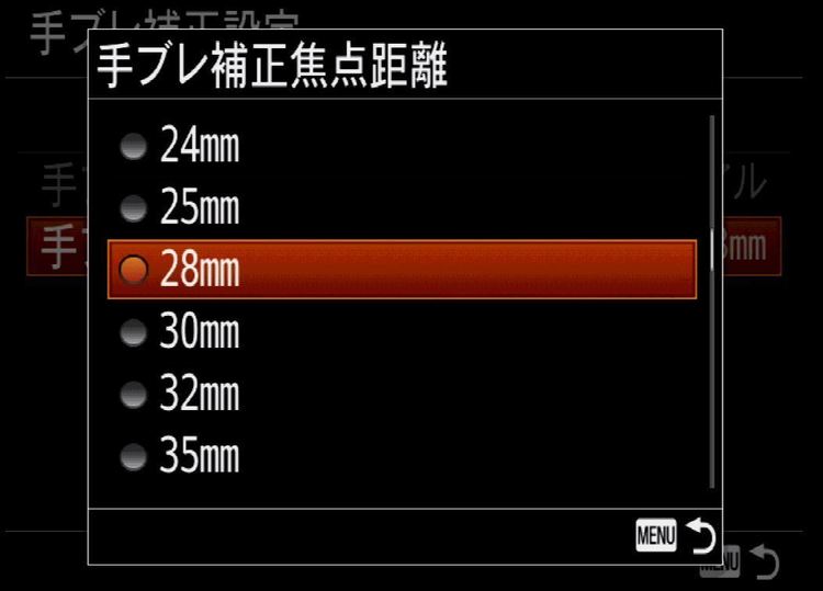 ここで少し気を付けなければいけない点は、手ブレ補正「入」に設定をした後に、「手ブレ補正設定」で「手ブレ補正焦点距離」の設定をして、使用するレンズの画角に設定を合わせる事が必要になります。