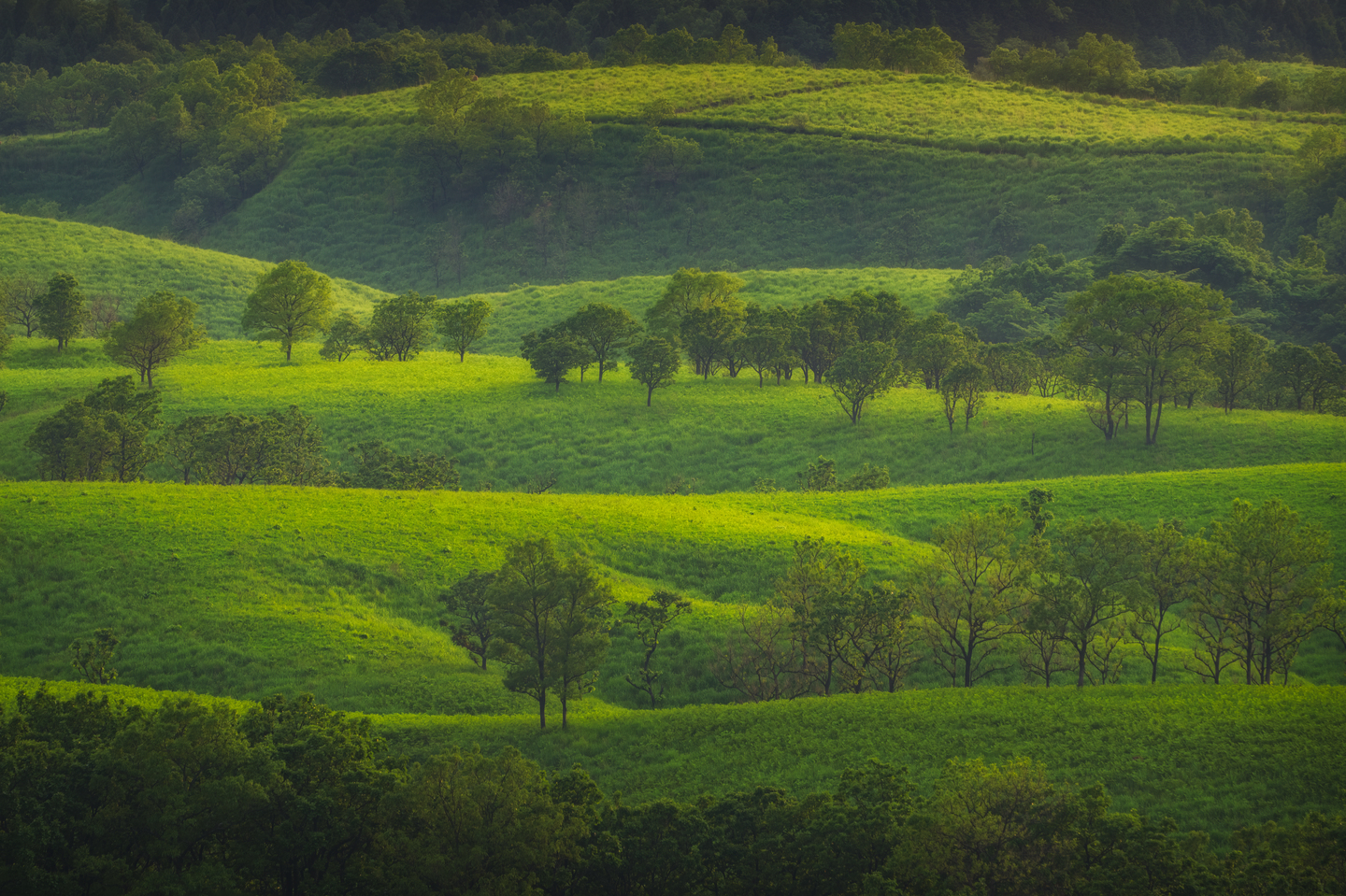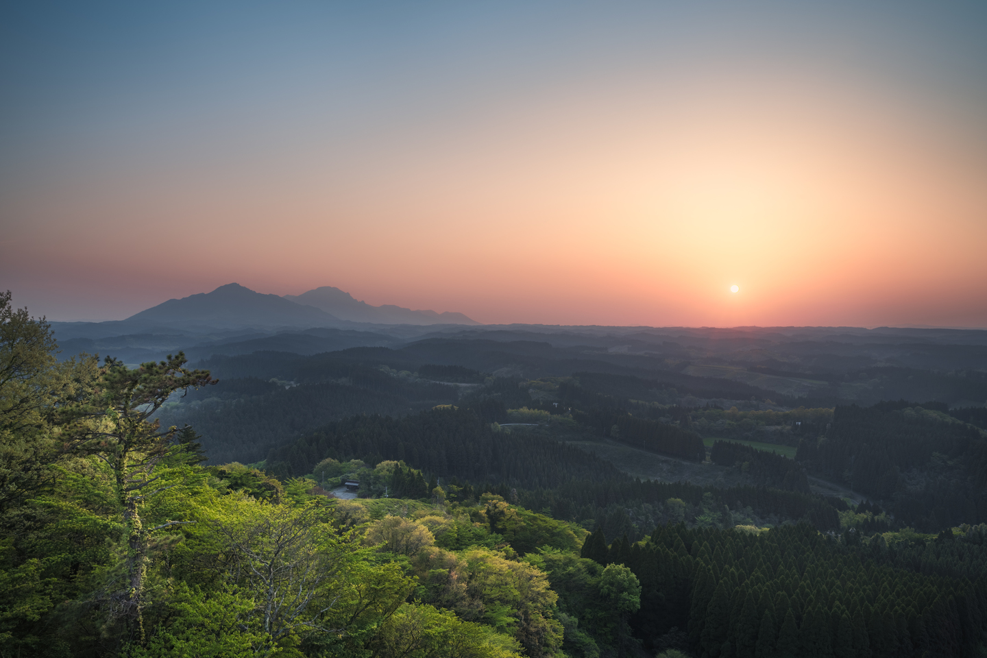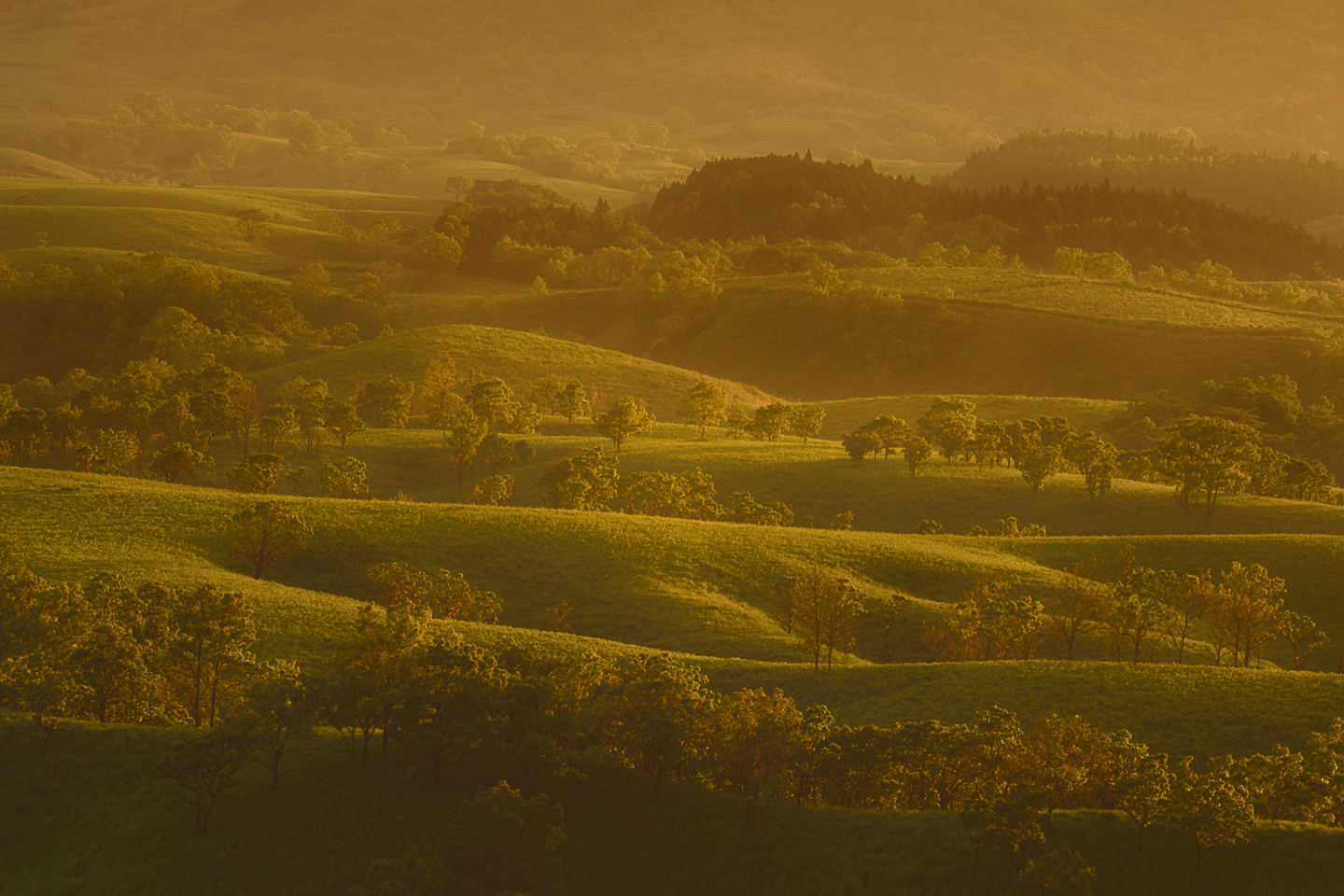 九州の阿蘇で撮影した一枚。夕日の柔らかく温かい光が遠くの丘を照らしている光景が目に飛び込んできたので、望遠レンズを使って撮影しています。